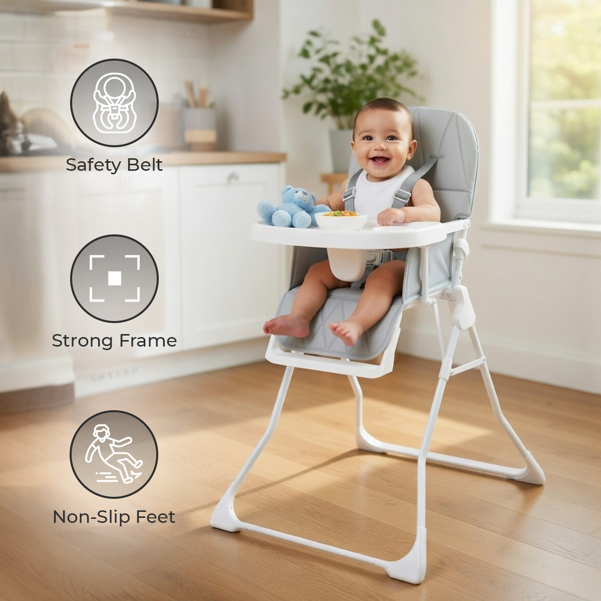 With a secure 5-point harness and non-slip feet, your baby stays safely supported during every meal. The stable structure is designed to minimise movement, giving you confidence while your child eats, plays, and explores from a safe seated position.