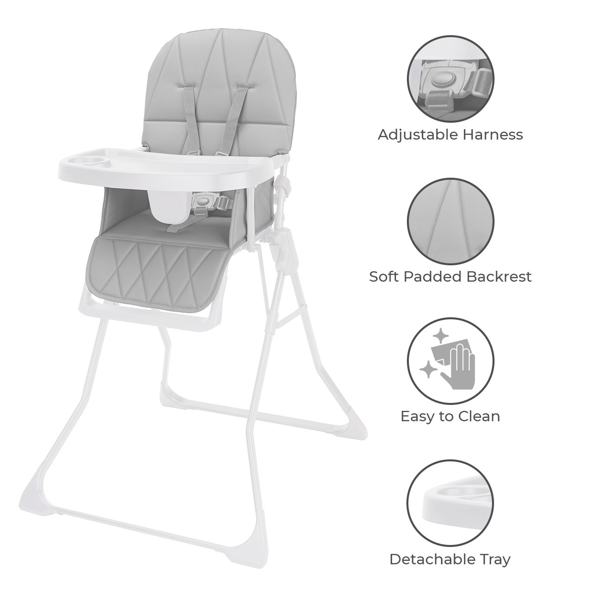 Mealtimes can be messy — your high chair shouldn’t be. Featuring an adjustable and removable tray for the perfect fit, along with a wipeable seat pad that makes clean-up quick and effortless, this chair is built to simplify your daily routine.