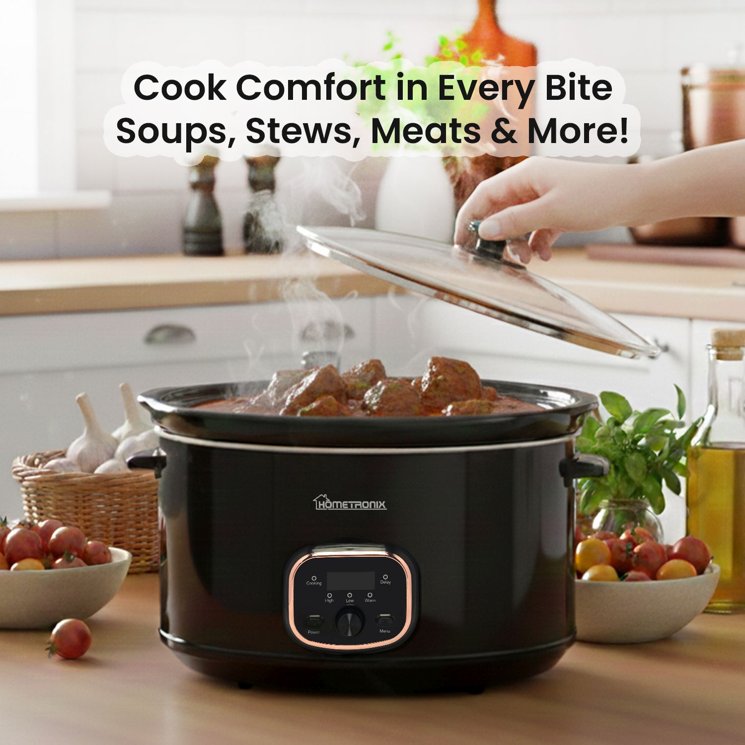 Designed with a tempered transparent glass lid, this slow cooker allows you to monitor your meal without releasing heat or flavour. As food cooks, condensation forms naturally and continuously bastes your ingredients, locking in moisture and intensifying taste. This process helps tenderise even the most economical cuts of meat while allowing vegetables to absorb spices, stocks, and nutrients—resulting in healthier, richer, and more satisfying meals every time.