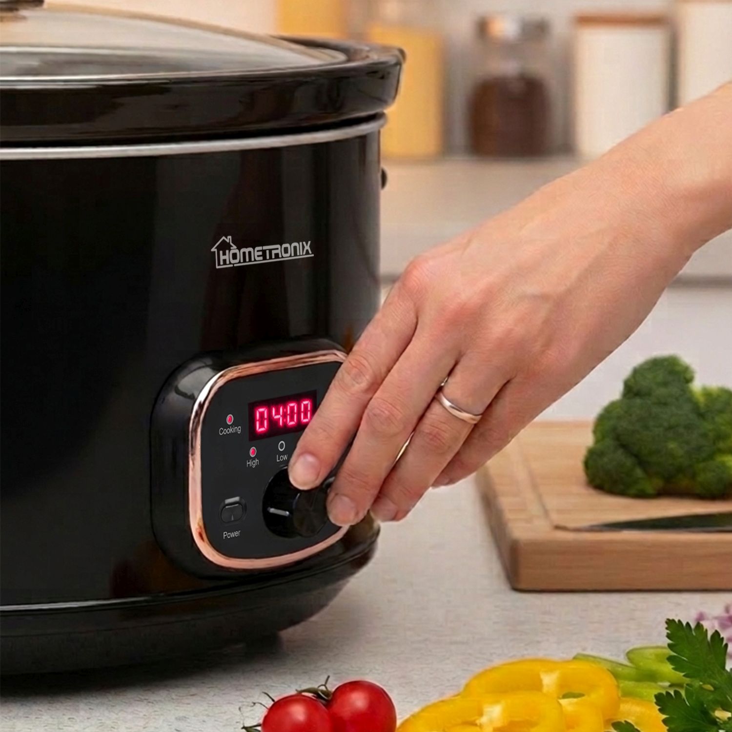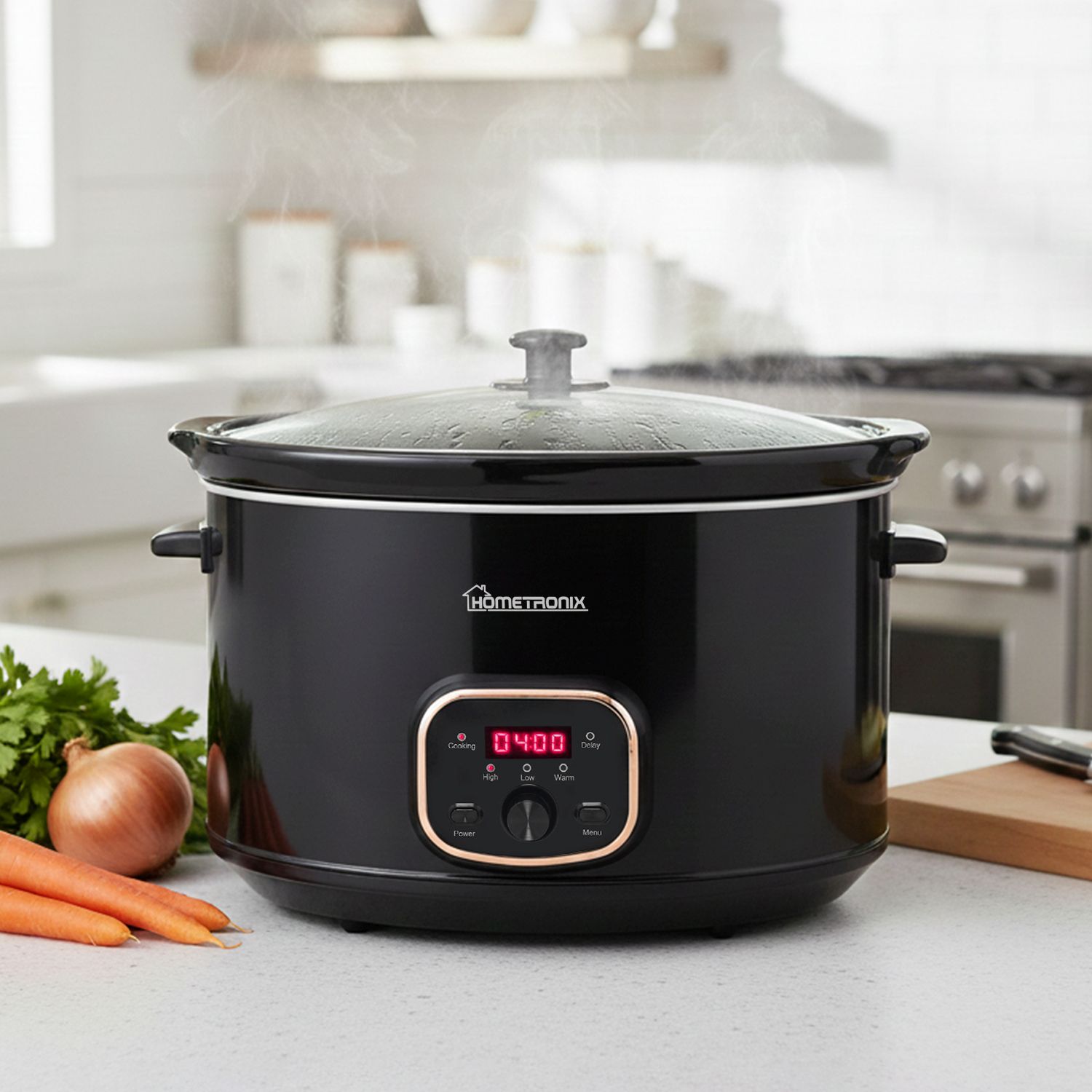 HomeTronix Premium Digital Slow Cooker 8L Large Capacity, Programmable Timer & Delay Start, 3 Heat Settings High, Low Keep Warm, Removable Ceramic Bowl, Glass Lid, Steam Grill for Family Black